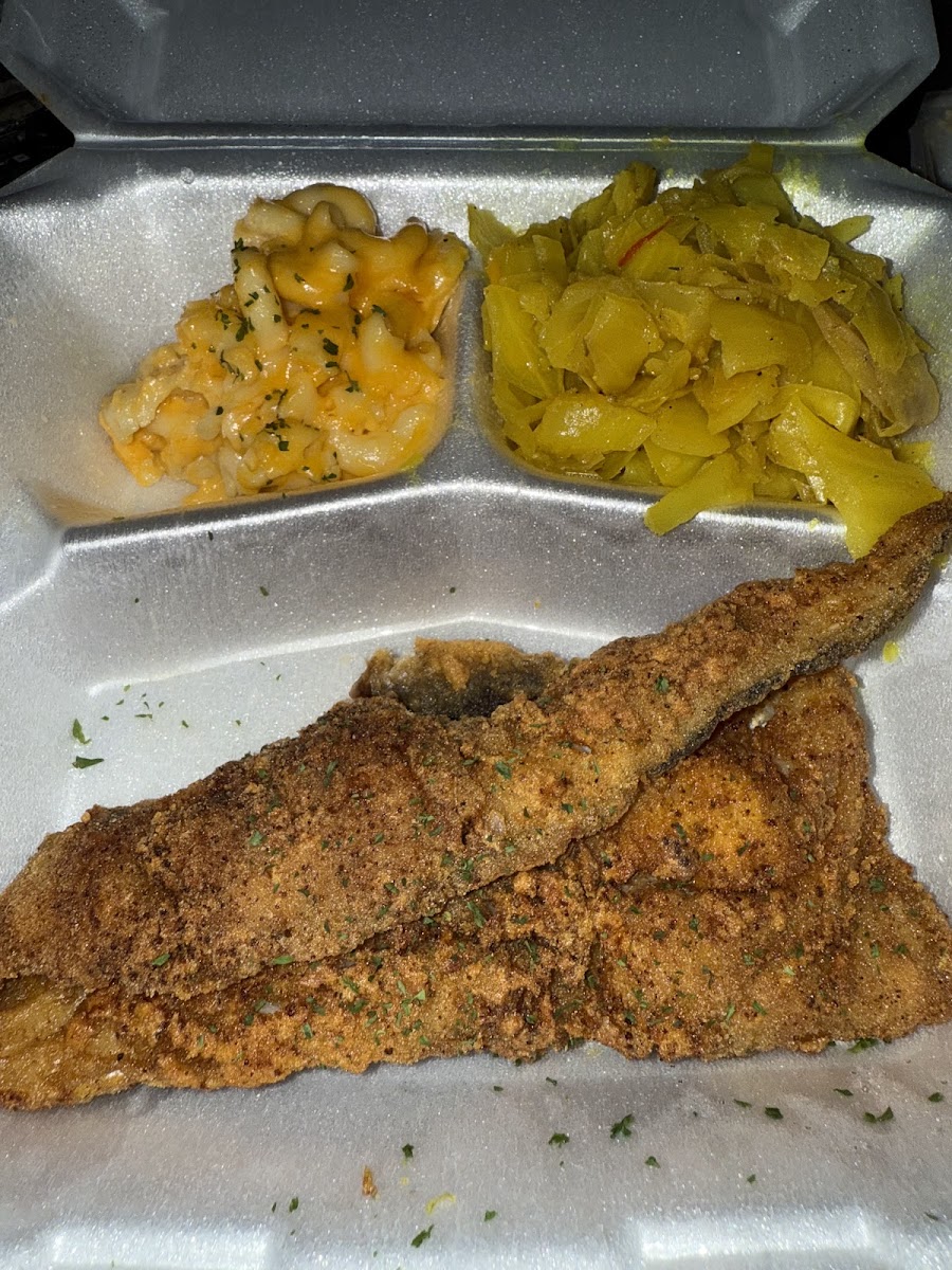 “ We had dinner here after church, nice relaxing atmosphere. Our server was so sweet and accommodating, and the food was amazing! We had the whiting dinner with sweet potatoe casserole, cabbage, bbq jerk chicken with potato salad, Mac and cheese along with ox tail with cabbage and Mac and Cheese the Mac and Cheese was so tender, ox tails tender and seasoned just right! Definitely will be back ”