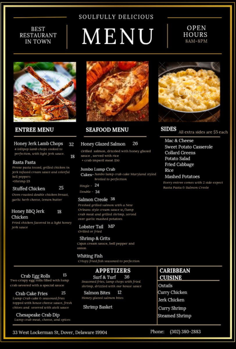 At Soulfully Delicious, located at 33 W Loockerman St, Dover, DE 19904, the menu offers an impressive selection that highlights both hearty comfort food and vibrant Caribbean flavors. For the main entrees, you can indulge in Honey Jerk Lamb Chops, a rich and flavorful choice, or opt for the creamy Rasta Pasta. Another standout is the Stuffed Chicken, paired with a savory filling that perfectly complements the tenderness of the meat. For a sweet and smoky twist, try the Honey BBQ Jerk Chicken.
